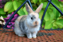 Красивый зайчик на скамейке в саду